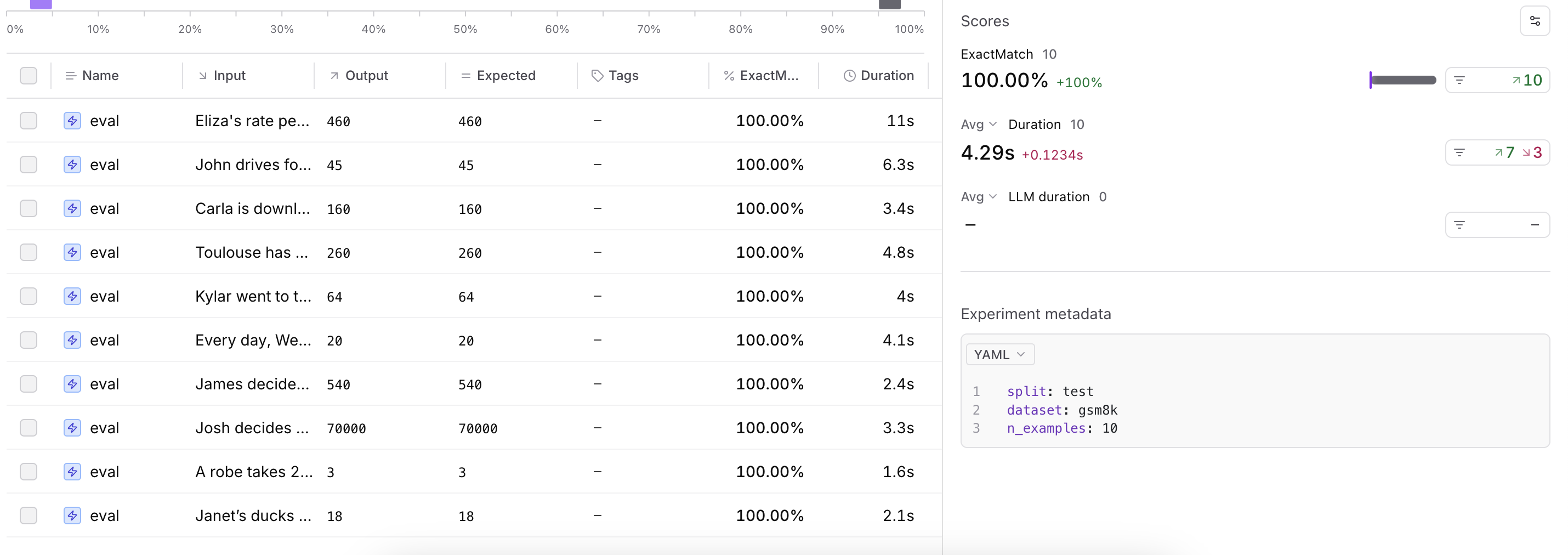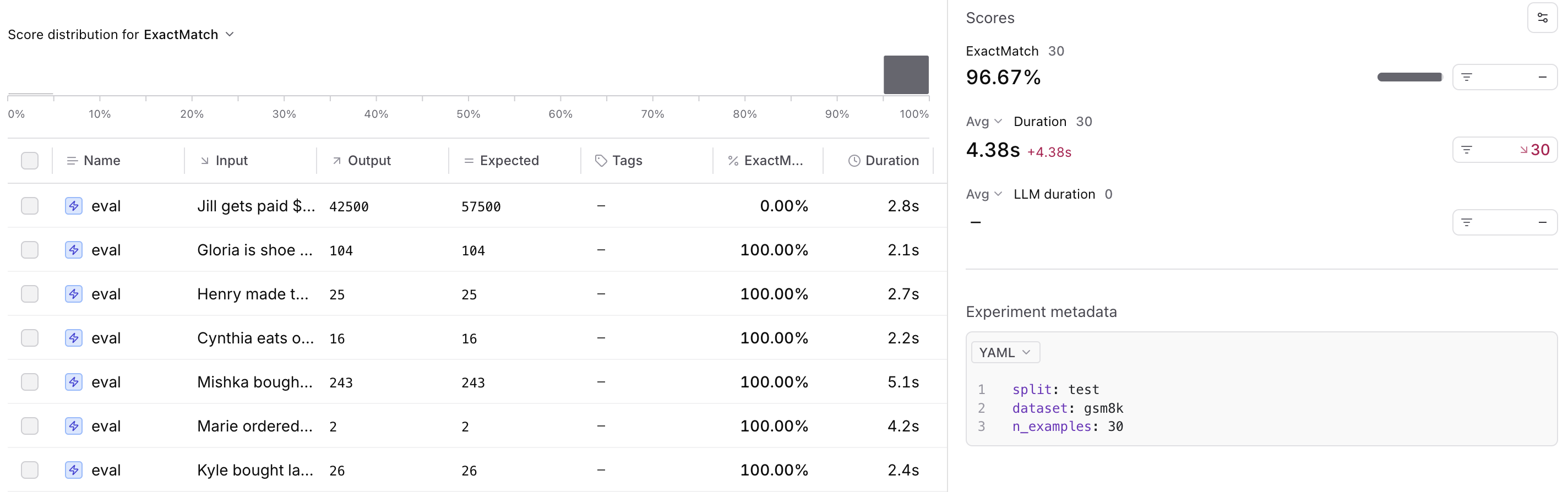 datalist, it will call thetaskfunction with theinputfield as the argument. - ExactMatch : ExactMatch compares the LLM's output to a predefined correct answer, returning a 1 or 0 for each individual example. This means that when we add it as a score, it will compare the response obtained from the