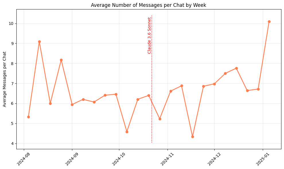 What's an interesting trend is that post-claude 3.6 sonnet, I've been having longer chats - we can see that there's an increasing trend here in the number of messages per chat.