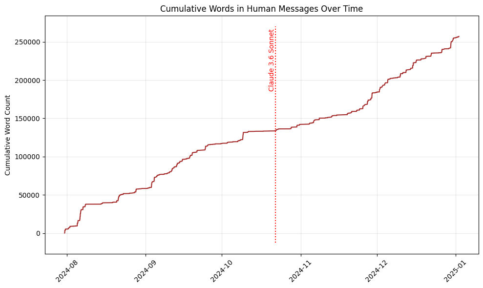 I'll write a separate post on how I did the analysis but I thought I'd share some of the results here. Here is a guide on how to export your Claude chat history.