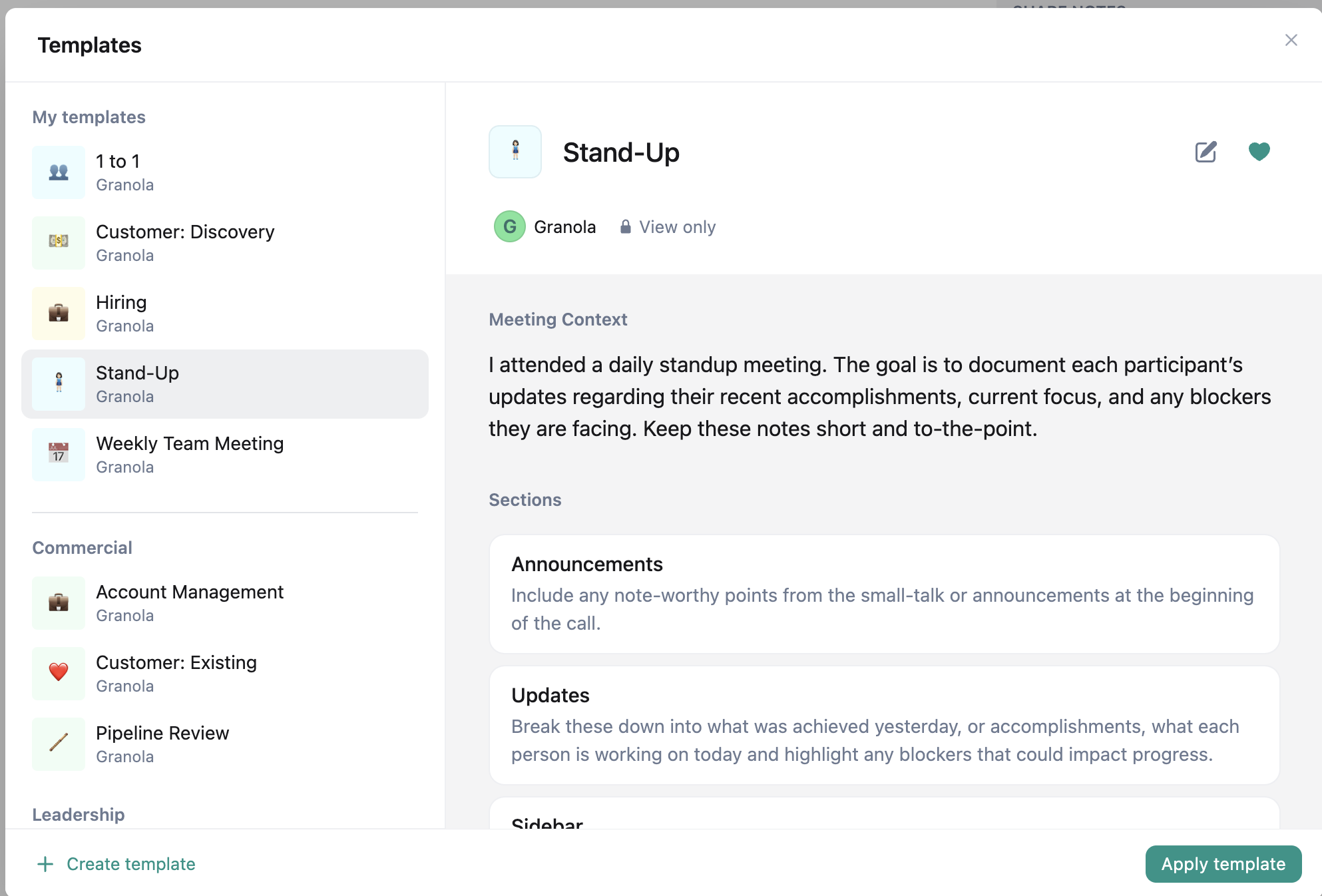 What makes Granola particularly effective is its template system. Users can customize how their meeting notes are structured and formatted: