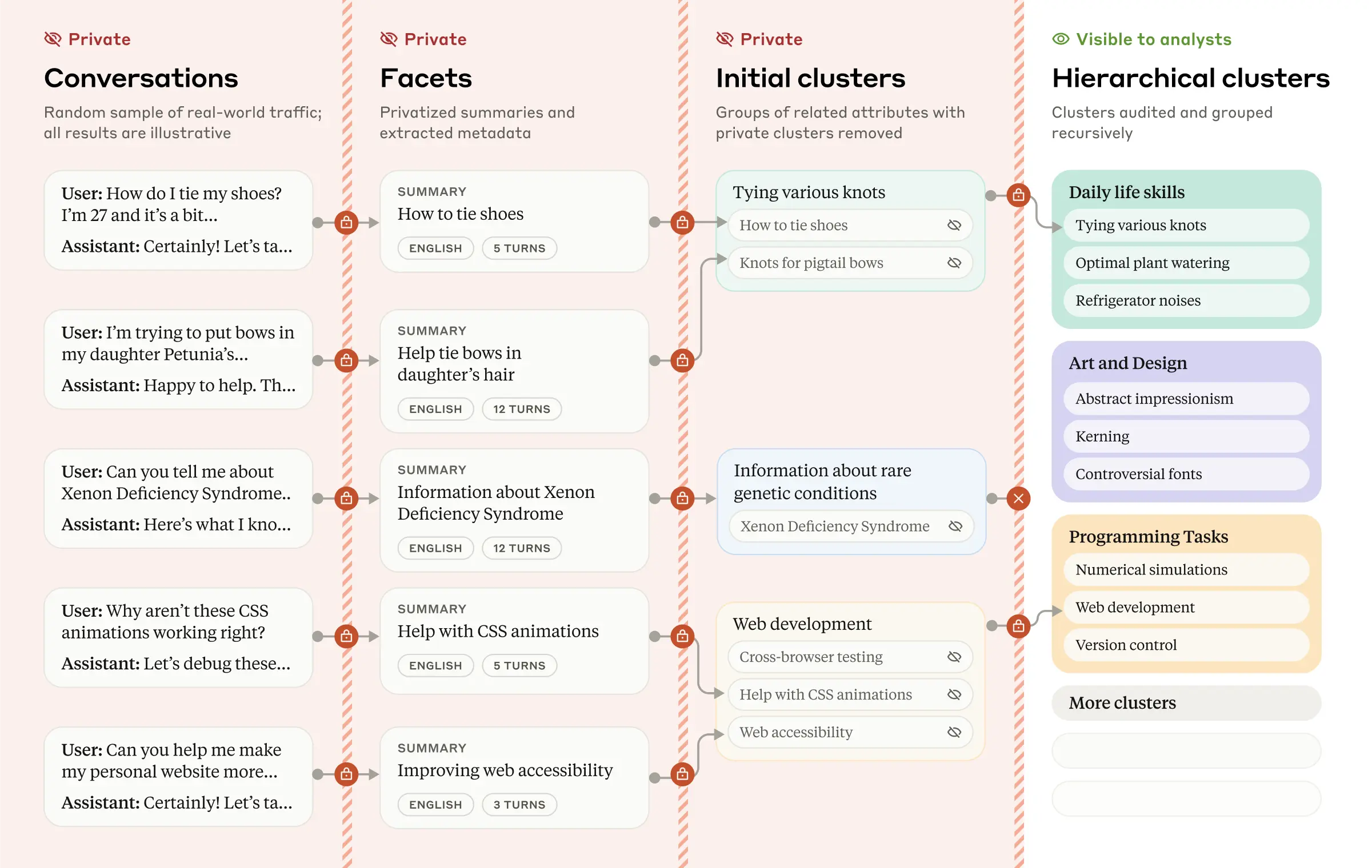- Clustering - Anthropic uses a K-Means clustering algorithm to group similar conversations/clusters together using their embeddings. The exact hyper-parameter of