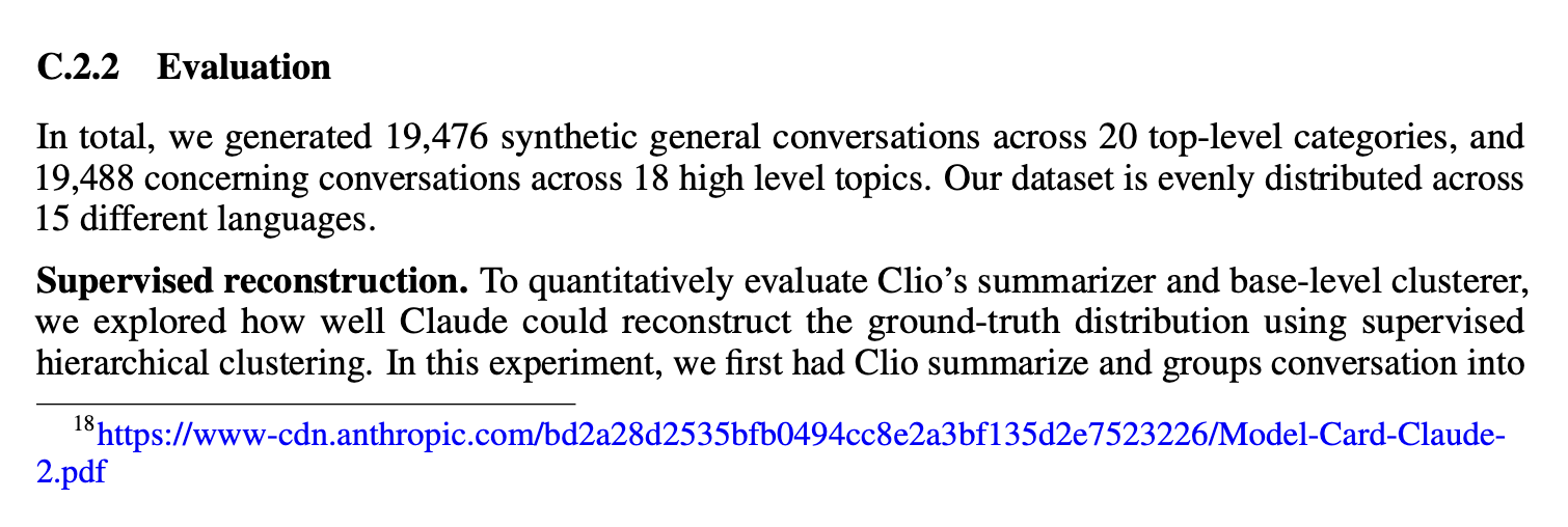 CLIO was validated by using a largely synthetic dataset that was generated by Claude. This comprised approximately ~20k conversations that spanned across 15 different languages and 18 high level topics.